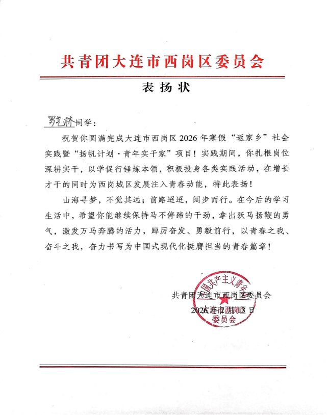 2026年寒假期间,我院食品质量与安全专业2025级本科生罗艺林同学,主动走进大连市西岗区市场监督管理局,以食品安全业务专干的身份,开展了为期一个月的社会实践活动,在实践中锤炼本领、践行使命。